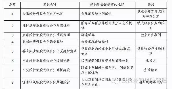 (2)合并一方为上市公司时,均需提供回售权,但考虑到上市公司收购自己股份的程序较复杂,因此一般提供现金选择权,提供方可以为关联方,也可为非关联方、独立财务顾问或主承销商。
