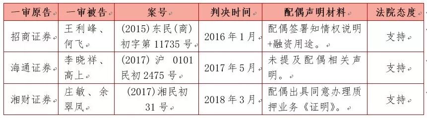 从公开渠道查询到的股票质押业务纠纷相关案例看出,不少券商给融资人提供融资服务时,会提前请融资人配偶出具有关同意融资人进行股票质押交易融资的证明或说明。就以下笔者搜索到的股票质押纠纷涉及到夫妻共同债务的公开案例来看,法院对配偶承担共同还款责任持支持态度,区别在于判决理由部分的说理成分。