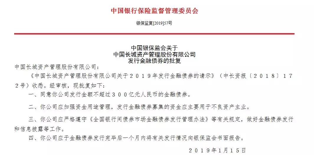 四大AMC获批发行金融债,投向债转股的情况并不多见。今年1月17日,银保监会同意长城资产发行300亿元金融债券,主要用于不良资产主业。