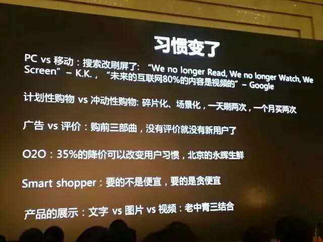 现在的时代非常碎片化、场景化,已经从计划性购物变成冲动性购物,产品要能抓住用户的习惯。买东西的决策也变了,以前没有互联网的时候,有层层经销商。而现在只要通过互联网打出去,我就可以调整各种参数,提高用户留存,而线下做不到这块,所以打广告的结果是没办法控制的。现在大家即使看广告,也还是要去看网上的评价,没有评价就没有新用户了,所以即使你到了餐厅门口,你还是会把大众点评打开,看哪些菜比较好销售,所以大众点评是很值钱的。