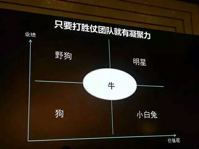 6、拿下小白鼠,员工可以按照业绩和价值观分为:明星、狗、野狗(业绩很好,但是拉帮结派,这种人要高调干掉)、小白兔(跟着你兢兢业业,勤勤恳恳,但是没有业绩,最后他们就熬成大白兔,但是因为他挡着,下面的人更糟糕,而且把你的时间耗掉很多,所以要怎么办?凡是老板拿下小白兔的,公司都会发展),作为老板,要敢于高调开掉“野狗”,让“小白兔”挪位,把所有的精力用来扶持“明星”,让“牛”失去左顾右盼的机会,奋力成为“明星”。