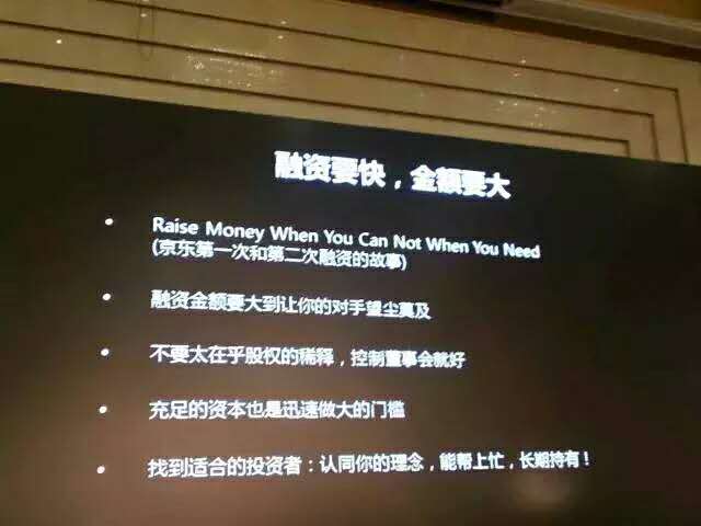 融资要快,金额要大,就像京东第一次融资,我们多给了5倍的钱。融资金额一定要大到让你的对手望尘莫及,不要太在乎股权的稀释,只要控制董事会就好,要有充足的资本。