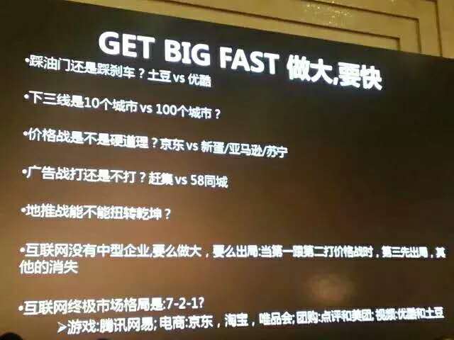 价格战打不打呢?团购、电商、O2O都会遇到这个事情。地推战能扭转乾坤吗?美团现在抢人很厉害,这个叫做“切客”,现在它的流量涨得很快,最后两方打得很激烈了。第一名和第二名打的时候,如果没第三名的事情,第三基本就出局了。互联网企业,要么做大要么做,没有中间企业,没有地头蛇,只有做到60-70%的市场占有率才有安全感。