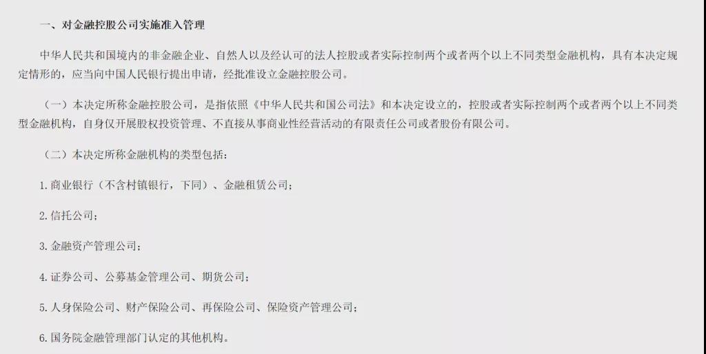 《准入决定》明确,对金融控股公司实施准入管理——中华人民共和国境内的非金融企业、自然人以及经认可的法人控股或者实际控制两个或者两个以上不同类型金融机构,具有本决定规定情形的,应当向中国人民银行提出申请,经批准设立金融控股公司。