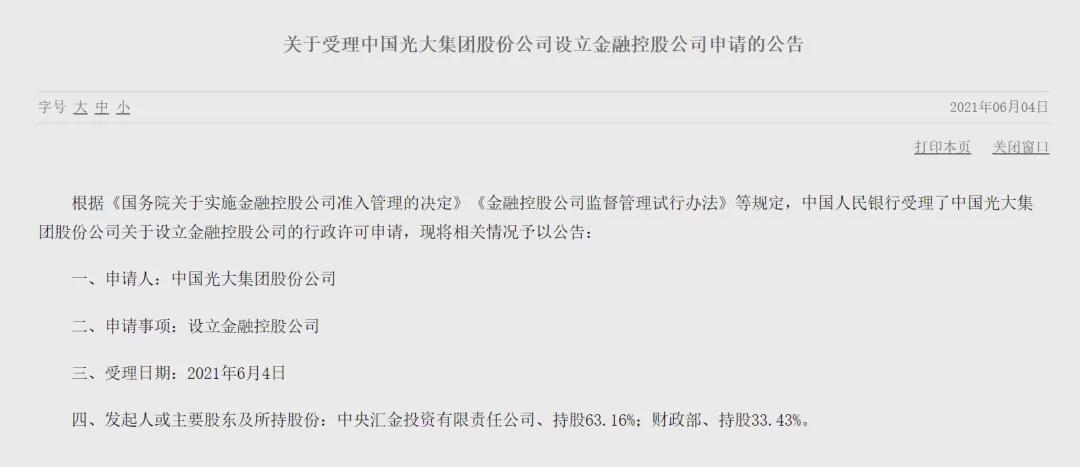 公告显示,中国中信有限公司所设立的金融控股公司由中国中信有限公司100%持股。中国光大集团股份公司所设立的金融控股公司由中央汇金投资有限责任公司持股63.16%,财政部持股33.43%。