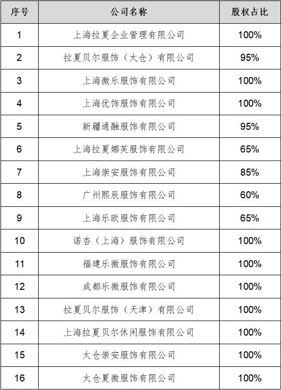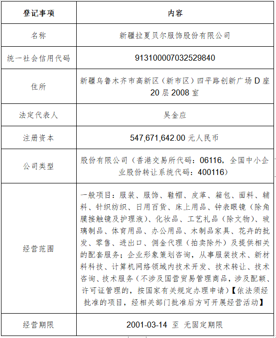 新疆拉夏贝尔服饰股份有限公司(曾用名:上海徐汇拉夏贝尔服饰有限公司、上海拉夏贝尔服饰有限公司),成立于2001年3月14日,注册地址位于新疆乌鲁木齐市高新区(新市区),实际办公地址位于上海市闵行区,是一家以从事服装销售及品牌综合服务为主的企业。