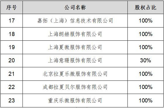 拉夏贝尔名下现存长期股权投资共23项,其中5家被投资公司已进入破产程序,具体如下: