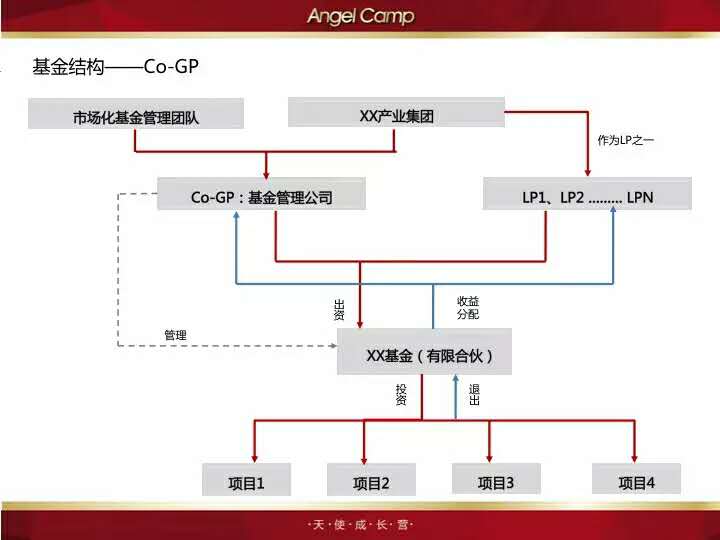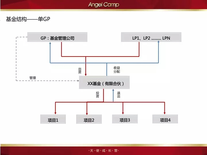 首先我们看基金的结构,这是一个比较简单的结构,就是单GP,有一个公司作为基金管理公司,通常来讲还是要公司制,因为GP要承担无限连带责任,如果是自然人的话,这里面可能比较麻烦,基金管理公司好在是有限责任,锁定风险的范围。后面一群出资LP,LP主要是出资,GP会出一部分,成立有限合伙。
