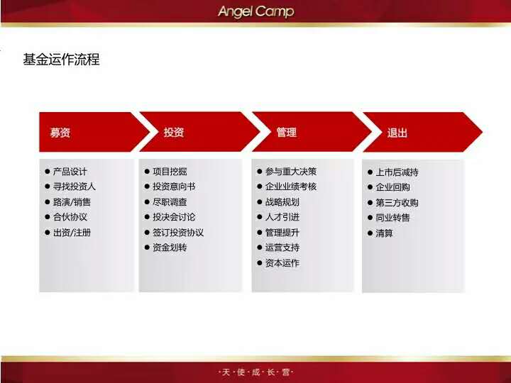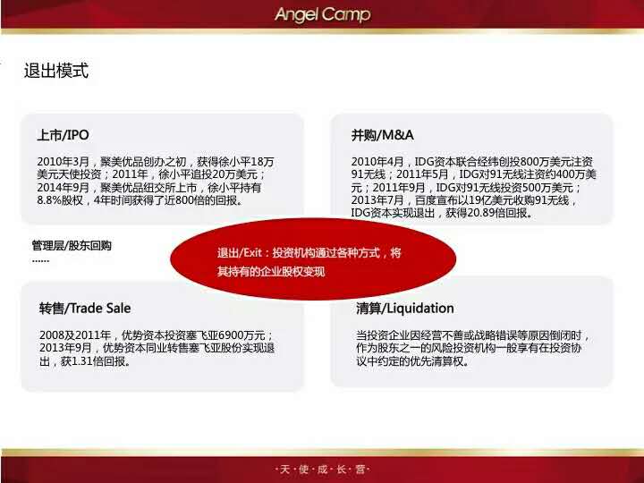 后面是基金退出,出售股权获得资金的回报。退出的模式有上市、并购、管理层收购转售清算等等,其实作为早期投资的话,最多的还是被收购,不管是整个企业被并购,还是后续的投资把我们的钱给收走。