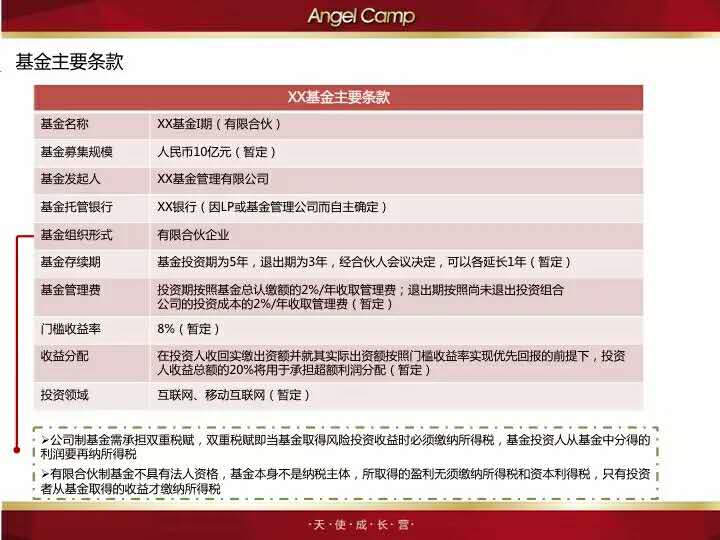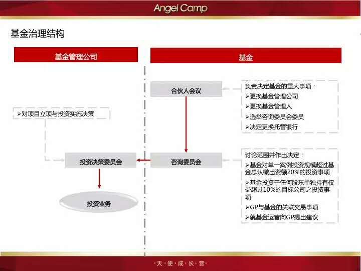 那么之所以选择有限合伙,不建议选择公司制,因为公司制还是有一个双重税收的问题。公司缴完一道所得税以后,回头把这个钱返回到个人的帐户上,个人还要再缴一次个人所得税。作为有限合伙,因为本身不是一个纳税主体,所以避免了双重征税。这是基金的治理结构,最高权利机构是合伙人大会,最重要的事情,比如说更换基金管理公司,更换基金管理人,选定有限合伙员,决定托管银行等,是合伙人大会,但是合伙人大会一年也不一定开一次,日常主要是投资决策委员会,由GP团队决定,我投不投哪个项目。