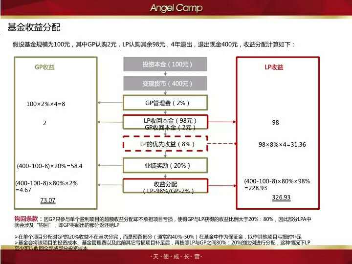 这个公式是扣除了LP的收益里面之后的收益,就不算了,因为这个如果大家真的来分钱的话,这个帐也比较容易算,当然也有一些是不按照这么算的,并没有把有限收益的8%放在里,是简单的直接算,超出部分20%、80%的分配,两种都有。