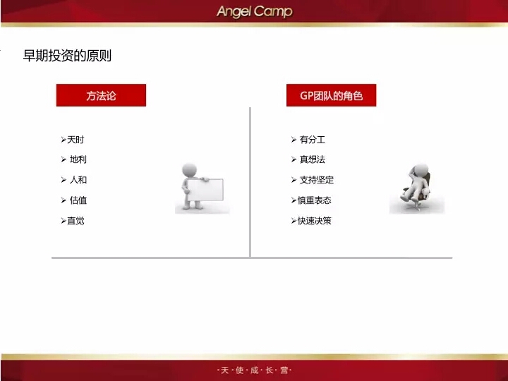 第一,我觉得这是我们正式上课的时候,童玮亮院长给大家讲的,也是成长营一直到现在的项目的评分表这么列的。我觉得这个可能也是作为很多早期投资人比较看重的方法论,就是天时、地利、人和、估值和直觉。