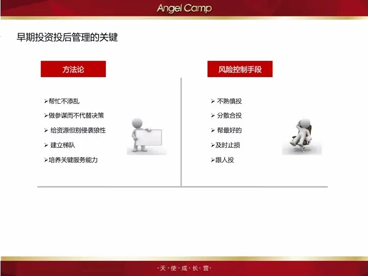 第五,要培养一些关键的服务能力。不管是做PR,还是我们能帮他去募资,有一些关键能力,是需要自己持续培养的。其实投后管理,也是我们风控的一些手段,万一我投的没那么好,可能我还可以通过投后管理做一些补充和调整,像我们下围棋一样,前面可能不太好,但是我们尾盘的时候做得好,同样也能有很大的收获,那么从风控的角度讲。