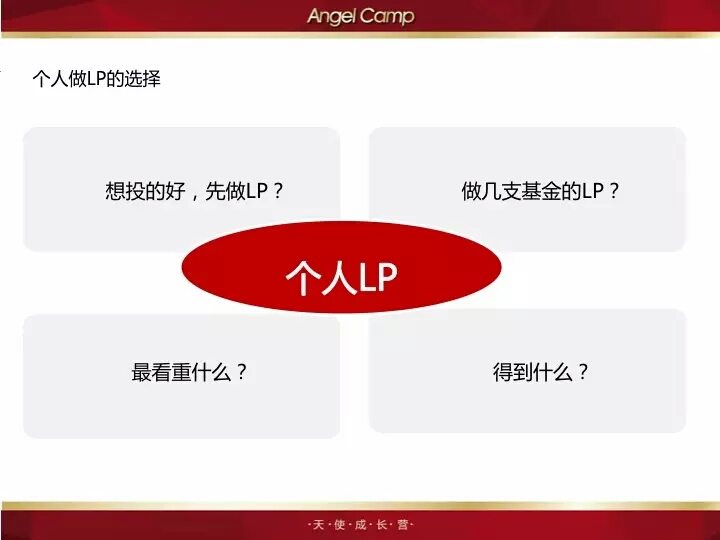做个人LP最看重什么?看重收益?还是自己的参与?还是两者并重?如果我们选GP的话,我们选什么,基本上我们说我们选业绩,但是路径依赖,过往的业绩就一定代表着这个团队未来能投得好吗?如果这个团队过往管的是两千万的基金,现在管的是三个亿的基金,他的投资能力一定能放大吗?他原来投的是天使阶段,现在已经管了几个亿的基金,已经开始投VC阶段了,这个时候就一定能做得好了,只看业绩恐怕也是有风险的,其实选GP和我们选项目有点像,最好也对这个GP有相对充分的了解和调查。