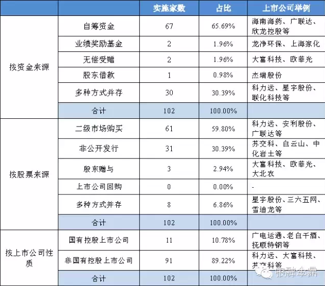 (2)股票来源方面,以二级市场购买居多。多种方式并存,主要指二级市场购买和股东赠与(如三六五网)或者草案出具时暂未确定采取何种方式(如龙净环保、科达洁能等)。