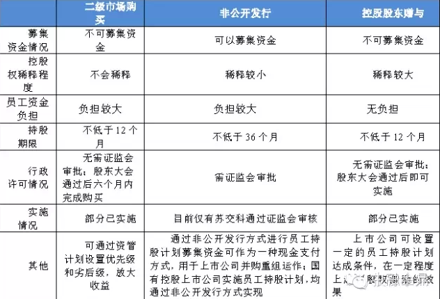 由于上市公司通过回购本公司股份实施员工持股计划流程较为复杂、持续时间较长,目前我国上市公司暂无采取此方式的情形。目前,上市公司实施员工持股计划主要采取二级市场购买、非公开发行和控股股东赠与等三种方式。上述三种方式综合比较如下: