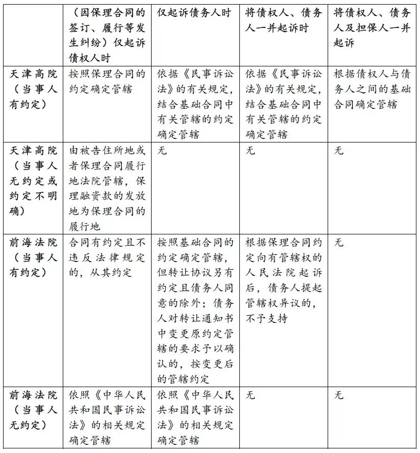 正是因为保理法律关系可能是涵盖了一系列法律关系的总和。导致实务中各地的法院对保理业务的管辖存在着一定差异,以下仅以天津高院和深圳前海合作区法院的裁判指引为例进行说明[注2]: