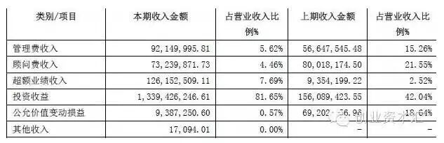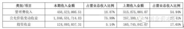 值得注意的是,在中科招商披露的收入构成中,管理费收入占营业总收入比例为19%,其中公允价值变动收益占比收入76%,为18.5亿元。根据年报显示,公允价值变动收益大幅增加是由于公司阳光举牌,所持有的上市公司股票市值上涨所致。