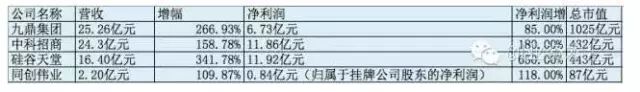 作为四巨头中市值最大的九鼎集团, 2015年营业收入为25.3亿元,同比增加267%,营业收入在四巨头中居首。净利润为6.73亿元(归属于挂牌公司股东的净利润为5.8亿元),同比增长85%。