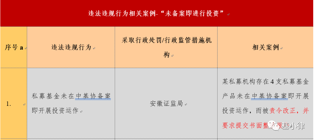 截至目前,证监会、地方证监局及中基协公示的涉及“未备案即进行投资”的处罚案例,包括私募基金行政处罚、行政监管措施以及纪律处分的部分案例,可参考如下总结。私募基金的募集、备案、投资是新设立基金首要进行的三个环节。关于私募基金备案完成之前能否进行对外投资的问题,私募机构应当关注三个方面的内容:首先,证监会及/或中基协就此问题的明确规定;其次,基金合同关于此问题的约定;最后,私募机构应当与托管机构(如托管)沟通其对此问题的实操要求。第一,关于证监会及/或中基协对私募基金未备案即对外投资的规定。根据证监会发布的《私募投资基金监督管理暂行办法》规定,私募基金募集完毕后,私募基金管理人应当根据中基协的规定,办理基金备案手续。根据中基协发布的《私募投资基金管理人登记和基金备案办法(试行)》规定,私募基金管理人应当在募集基金完毕后的20个工作日内向中基协办理备案手续,经备案的私募基金方可申请开立证券相关账户。