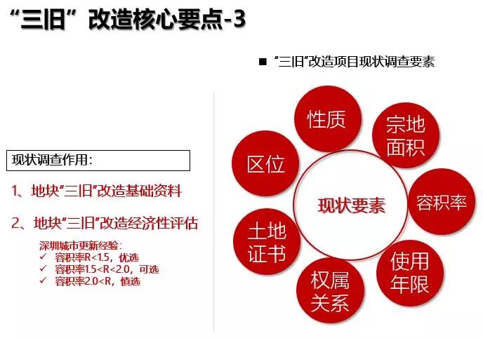 “三旧”改造是在城市发展到一定阶段后,土地集约化发展要求下,针对“旧城镇”、“旧厂房”和“旧村居”的改造。广东省78号文中并没有明确确定“三旧”的内涵,但对“三旧”改造的范围进行了界定,主要把下列6项土地列为“三旧”改造范围: