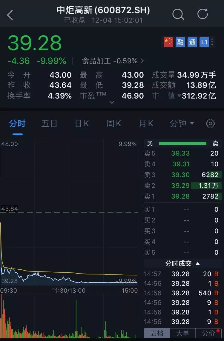 中炬高新今日早盘闪崩,低位震荡后最终跌停。中炬高新最新价格报39.28元/股,成交额13.89亿元,市值缩水34.7亿元。
