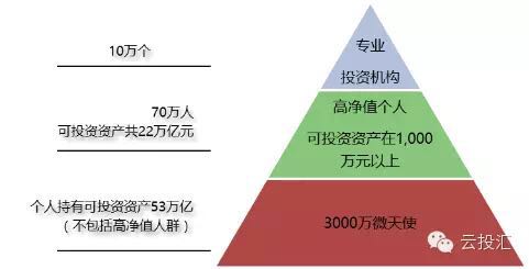 据统计,我国有3000万微天使,可投资资产累计达53万亿;有70万高净值个人,可投资资产累计达22万亿。在上述群体中,尤其是对于中国新兴中产阶级而言,严重受困于财富配置渠道的单一,迫切需求多元化的资产配置方式。