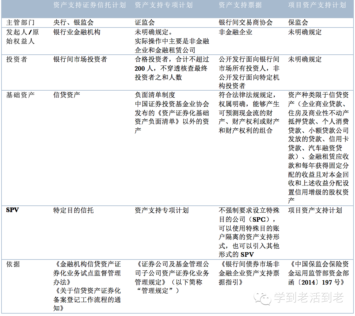 上述资产证券化业务类别中,信贷资产证券化采取SPT的形式,资产支持专项计划和项目资产支持计划实际上可以归为SPE,实践中,ABN很多时候并不使用SPV。