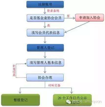 5、登记时限:材料完备的,基金业协会应当自收齐登记材料之日起20个工作日内,以通过网站公示私募基金管理人基本情况的方式,为私募基金管理人办结登记手续。