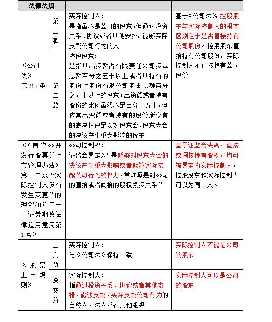 《公司法》、证监会及沪深交易所的法规中,对实际控制人的界定有差异,如下图所示: