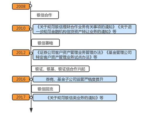 从本质来看,通道业务的兴起一般基于两种目的:一是规避监管、隐藏底层资产。作为被高度监管的企业,银行在发展业务以及追求利润的同时,受到监管对于银行(作为资金方)的诸多限制(如信贷额度、MPA考核、资本充足率、理财业务范围等),导致银行往往会借助通道进行监管套利,比如将资产转移到表外,降低表内信贷额度以腾挪信贷空间,改善银行指标等;二是协助管理的需求。一般由于银行(作为资金方)考虑到自身软硬件(如交易能力、投资管理人员、系统建设等方面)不足,便需要利用通道作为服务外包、构建特定交易结构的手段。根据银行通道业务的主要发展脉络,我们可大致绘制出如下时间轴: