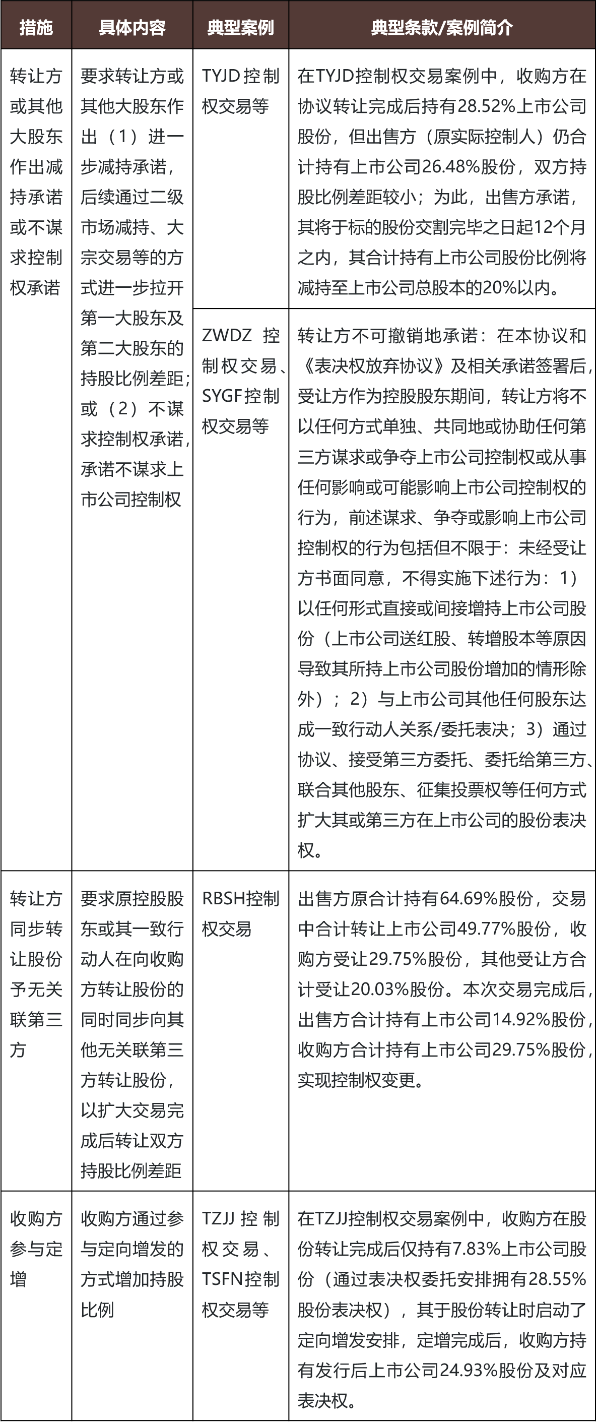 受限于各种现实因素,在部分交易中收购方的确不能在交易后实现与第二大股东之间较大比例的股比差异,在这种情况下,交易双方可以考虑采取下述措施以实现控制权转移: