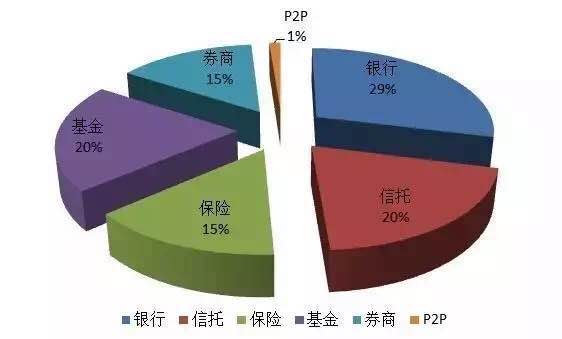 截至2015年底,我国金融机构和第三方理财总规模为81.18万亿。银行、信托、券商和保险是最大的理财机构。其中:银行23.5万亿,占28.95%;信托16.3万亿,占20.08%;券商11.89万亿,占14.65%;保险11.86万亿,占14.61%;基金公司16.65万亿,占20.51%,其中包括基金专户4.03万亿,基金子公司8.57万亿和私募基金4.05万亿;互联网P2P理财规模为9800亿,占1.21%。