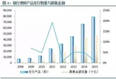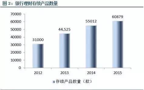 截至2015年末,各类银行理财市场存续产品60879只,账面余额超过23.5万亿元,同比增加8.48亿元,增幅56.46%。无论从存续产品数还是存量规模来看,我国银行理财产品的规模都大幅增长。