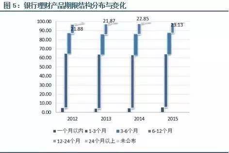 从期限结构上来看,根据wind披露的数据,银行理财产品历年来的期限结构较为稳定(见图5), 三个月以内的短期理财产品占比达到65%左右,半年以内的理财产品占比达85%,超过一年以上的理财产品占比只有约1%,这种以短期产品为主的期限结构与银行将理财产品作为规避存贷比监管并将其作为存贷款的一种替代工具有很大关系。