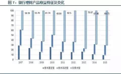从收益类型角度来看,2015年新发行的理财产品中,非保本型产品规模上升,保本固定型产品规模下降,保本浮动型产品规模与2014年基本持平。2015年,非保本型产品占整个理财市场的比例为69.8%,较2014年底上升2个百分点;保本浮动收益类产品占整个理财市场的比例为20.6%;保本固定型占整个理财市场的比例为9.6%,较2014年底下降2个百分点(见图7)。