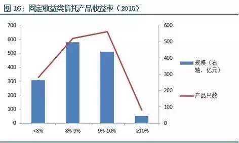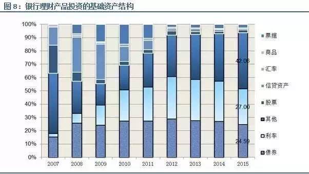 受竞争压力、行业监管及市场需求驱动,银行理财业务创新不断提速——以同业通道为桥梁,银行理财产品覆盖了货币、利率、汇率、资本、商品、产权等多个市场,较大程度上满足了居民与企业的财富管理需求。根据wind披露的数据,银行理财产品的基础资产中债券、利率等安全性较高的资产占比达到50%以上,这与银行理财追求较高的安全性有关。同时,值得关注的是,“其他类资产”占比在2015年大幅上升,达到42%(见图8)。我们认为,“其他类资产”大部分投资于非标准类债券类资产,非标产品比例的大幅提高,说明了银行在券商理财、保险理财等大资管的竞争压力下不得不提高风险资产比例,以满足投资者对收益率的需求。