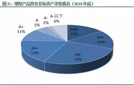 截至2015年底,银行理财产品所投资的非标资产中,评级为AAA的非标资产占比为15.10%,评级为AA+的非标资产占比为16.13%,评级为AA的非标资产占比为25.75%,评级为A-以下的非标资产占比仅为6.33%(见图9)。说明银行理财产品投资于非标资产的部分安全性也较高。