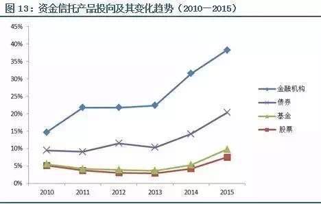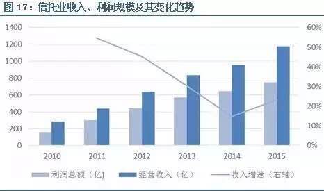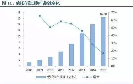 截至2015年底,我国信托资产总规模达16.3万亿元 。 自2012年至2015年,信托业受托资产规模增速从55%一路下滑到16.6%(图11)。在这样的政策和市场环境下,信托业只好积极谋求转型,减少依靠制度优势的通道型业务比重,增加主动投资管理的业务比重,并以此打造自身在金融市场上的核心竞争力。