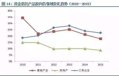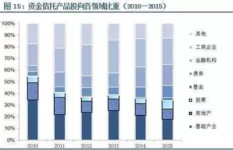 由于实体经济的形势严峻,金融机构成为信托资金投资的优选对象。2015年信托资产投向金融机构占比为17.93%,与2014年的占比基本持平。