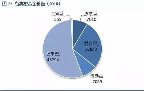 由于牛市的赚钱效应,2015年市场共新发基金839只,同比增长141%,发行募集份额1.49万亿份,是2014年的4倍。从发行产品类型上看,新发基金中权益类产品规模最大,分别达到11524和3616亿份,货币型与债券型等类固收产品发行规模偏小,只有500多亿。截至2015年末,我国公募型证券投资基金数量共计2694支,资产净值达83491万亿元,同比增长87.44%。其中货币基金资产净值达45794亿元,占总资产的一半以上,同比增长109%;其次是混合型,2015年末资产净值达22843亿元,同比增长近10000亿元;股票型基金资产净值7010亿元,同比增长24%;债券型基金资产净值达7038.7亿元,同比增长103%;QDII基金规模为564.82亿元,同比增长19%(图1) 。