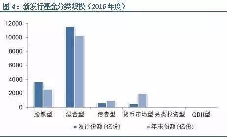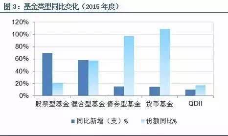 下半年A股市场断崖式的下跌,使得权益投向类型基金(股票型及混合型)遭大量赎回,表现为股票型与混合型基金份额增速有限;债券市场2015年延续了2014年的牛市行情,叠加A股市场的大跌行情,固定收益型基金产品迎合了市场对低风险理财产品的偏好,在数据上表现为债券及货币基金份额急速膨胀,较2014年同比大幅上升。