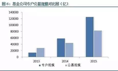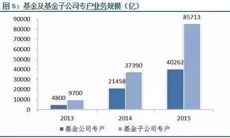 根据基金业协会披露数据,截至2015年底,基金公司专户业务规模达40262亿元,较2014年底增加近2万亿元,增长幅度达88%;基金子公司业务规模达85713亿元,较2014年底增加48000亿元,增长幅度达130%(见图5)。由此可见,2015年A股市场的震荡并没有影响基金公司及其子公司专户业务的井喷式发展,自从2014年基金公司非公募业务首次超过公募业务后,基金公司非公募业务与公募业务的差距在2015年进一步扩大。