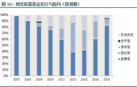 2015年,阳光私募产品在发行数量与发行规模上都呈现爆发式增长递增,全年共发行16878只产品,平均发售规模为1亿元,发行总规模达2030亿元,较上年增长123%。私募证券基金小型化和风格化趋向明显。私募产品只对特定对象发售,目标群体风险承受能力强,期望收益也较高,故私募产品投向股票市场领域较多,再加上2015年上半年A股牛市行情,使得新发行的私募产品中投向股票的比例高达82%。受行情影响,投向债券领域私募产品比例明显降低,只有9%,同比下降近20个百分点;与此同时,对冲、量化、期货类基金产品规模也有所萎缩。