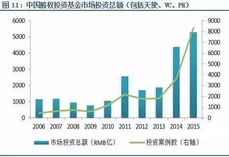 2015年中国股权投资基金共投资案例数8365个,投资案例数较上年有巨幅增长,投资金额5300亿元,较上年增长21%。