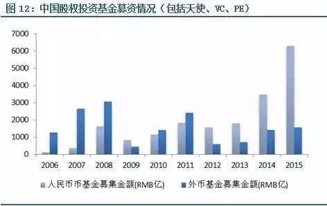 2015年,中国股权投资基金共募集金2970只,总金额7849亿人民币,较2014年增加2955亿元。其中人民币基金募集金额6298亿,募集基金数量2850只;外币基金募集金额折合人民币1511亿元,基金数量120只。
