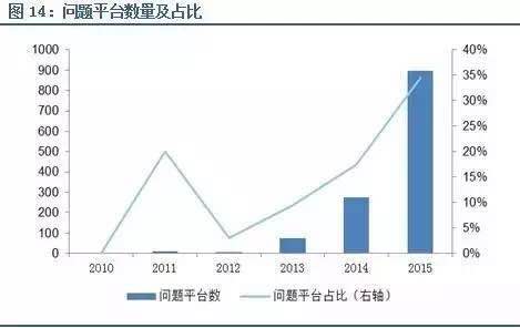 随着宏观经济下行和部分企业财务状况的恶化,2015年,P2P平台的违约现象日益严重。全年问题平台(包括停业、跑路、提现困难、经侦介入)数量为896家,是2014年的2.26倍。问题平台中跑路的占55%,提现困难占29%,停业占15%,经侦介入占1%。e租宝事件使得大家对P2P的风险格外关注。