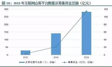 2015年8月7日,证监会下发《关于对通过互联网开展股权融资活动的机构进行专项检查的通知》,互联网众筹融资从此告别无监管的时代。和其他互联网金融业态相比,互联网众筹行业规模较小,2015年众筹行业筹集资金仅占P2P网贷成交金额的1.2%。但是,众筹融资的增长速度却高于其他任何一种互联网融资方式。2015年,正常运营的互联网众筹平台数量为283家,比2014年增加了一倍;全年共筹集资金114.24亿元,是2014年的5.3倍。