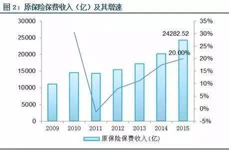 保险业保费收入是保险业资产最重要的来源,原保险保费收入自2011年以来,总量与边际上都有了大幅提高,2015年底,原保险保费收入达24282.52亿元,较2014年底增加20%(图2)。