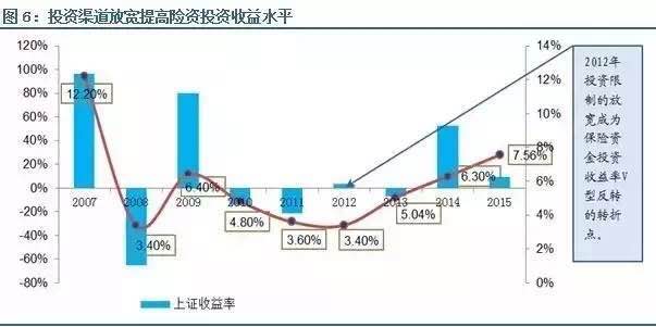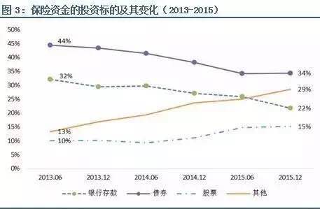 2015年保险资产运用投资收益7803亿元,投资收益率7.56%,创近七年新高 。 自2012年以来,保监会出台包括债券、股权和不动产等在内的一系列新政,大大放宽了保险资金的投资范围及比例限制,允许保险公司根据自身配置需要投向各大类资产,既局部放宽了保险投资境内外的传统标准化资产的比例限制,也新增了相对收益率更高的非标资产——在新政的“其他类金融资产”分类中,境内资产管理业的理财产品几乎悉数纳入,保险可投资资产类别丰富化不仅提高资产组合抗风险能力,同时也提高保险投资使用效率。在利好新政的刺激下,保险资金一方面降低对债券、银行存款等传统固定收益类资产的配比,另一方面加大对债权计划、信托计划等较高收益的新型固定收益类资产的配置力度,同时保险公司还在增加对非上市公司股权、境外资产的配置。从虚拟经济到实体经济、从传统市场到另类市场、从国内市场到国外市场、从私募领域到公募领域,保险资金的投资领域已经非常广泛,资产配置结构也发生了变化。